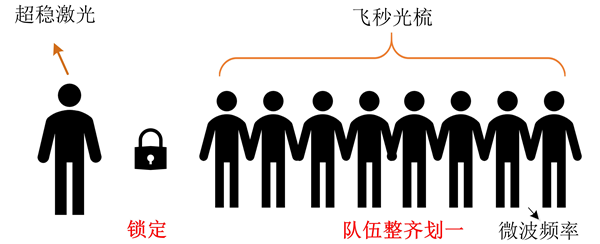 如果把超穩(wěn)光生微波源比作排隊(duì)走的隊(duì)列,那么超穩(wěn)激光就像隊(duì)列里面的帶隊(duì)人,隊(duì)伍的步伐大小、整齊度、每位隊(duì)員的相對位置都由這個(gè)領(lǐng)隊(duì)決定。飛秒光梳就像隊(duì)列里面的隊(duì)員,在沒有和超穩(wěn)激光建立聯(lián)系之前,光梳是自由運(yùn)轉(zhuǎn)的,就如圖 6中所示的一樣混亂。而當(dāng)通過一系列復(fù)雜的操作和領(lǐng)隊(duì)建立聯(lián)系后,就能使得每位隊(duì)員的步伐大小、步速、以及和其他隊(duì)員的相對位置都和領(lǐng)隊(duì)高度同步,如同圖 7所示,這樣就產(chǎn)生的超穩(wěn)光生微波信號。