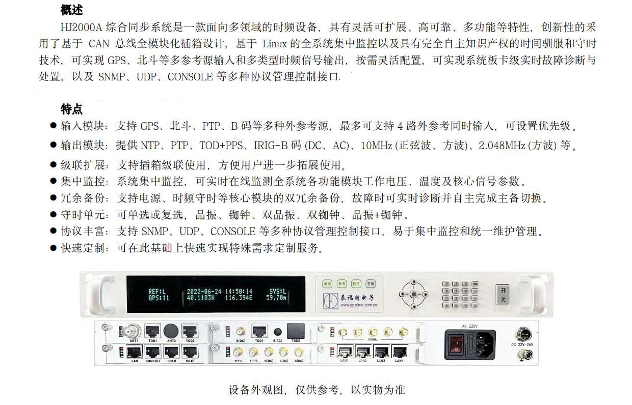 HJ2000A 綜合同步系統(tǒng)是一款面向多領(lǐng)域的時頻設(shè)備,具有靈活可擴展、高可靠、多功能等特性,創(chuàng)新性的采用了基于CAN總線全模塊化插箱設(shè)計,基于Linux 的全系統(tǒng)集中監(jiān)控以及具有完全自主知識產(chǎn)權(quán)的時間馴服和守時技術(shù),可實現(xiàn) GPS、北斗等多參考源輸入和多類型時頻信號輸出,按需靈活配置,可實現(xiàn)系統(tǒng)板卡級實時故障診斷與處置,以及 SNMP、UDP、CONSOLE 等多種協(xié)議管理控制接口,可廣泛應(yīng)用于...